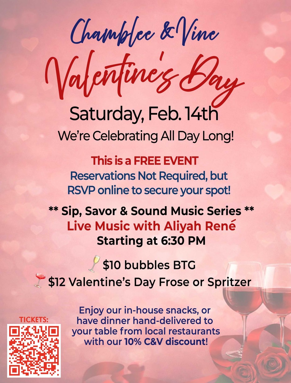 Soft candlelight, good wine, and music that fits the mood. Join us at Chamblee & Vine for a simple, elegant night with Aliyah René—timeless tunes, gentle swing, and an easy sense of romance, starting at 6:30 PM. Enjoy bubbles by the glass or a Valentine’s Frosé!